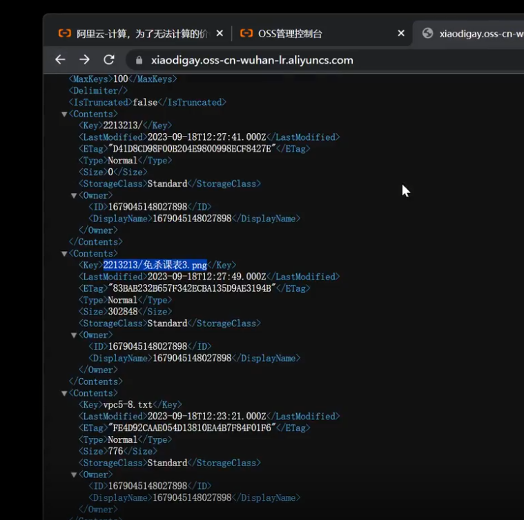 这样通过返回内容的不同,就可以进行 Bucket 名称爆破了,知道 Bucket 名称后,Key 的爆破也就很容易了
