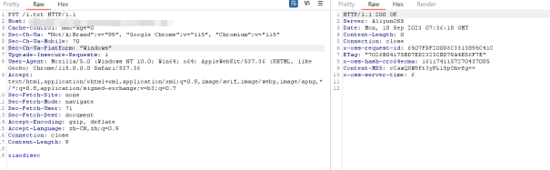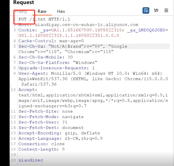 将权限改为公共读写后, 我们可以抓包将GET改为PUT, 达到一个任意文件上传的操作